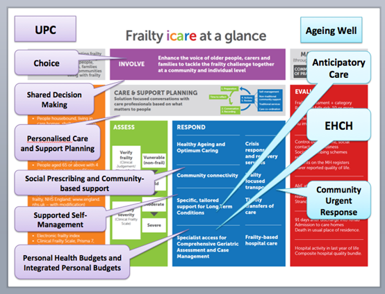 The following diagram shows the alignment of frailtyicare and the NHS Long Term Plan to Universal Personalised Care and Ageing Well: